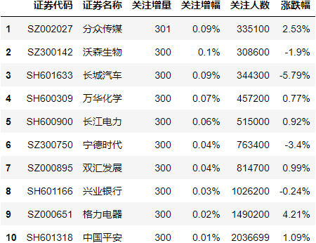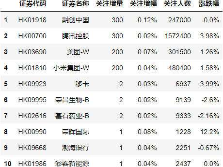 最后,我们为大家揭秘雪球网(https://xueqiu.com/)最新所展示的沪深证券和港股关注人数增长Top10。