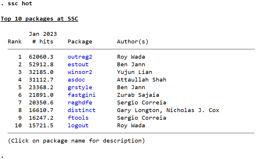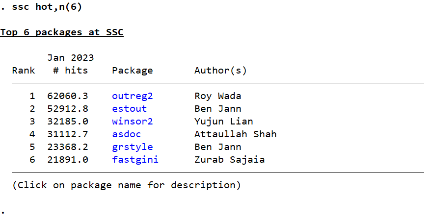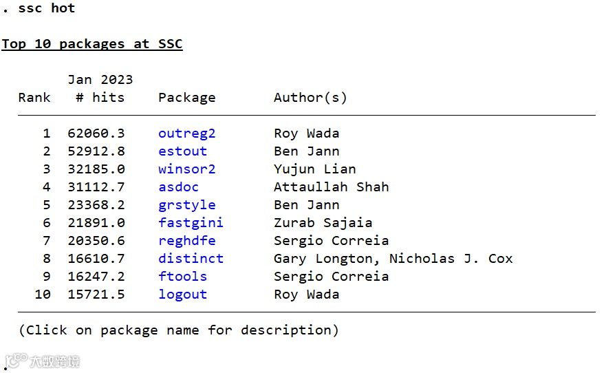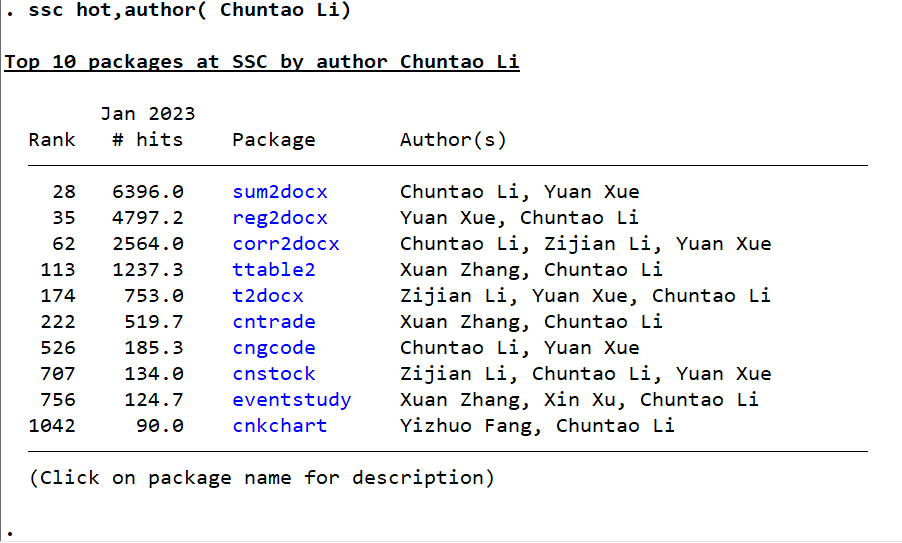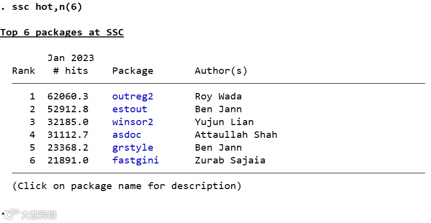 ssc hot提供了在ssc上最流行的命令的列表。这些命令都可以使用ssc install命令直接进行安装。当然,也可以直接点击命令名称(Stata窗口中显示为带链接的蓝色),在弹出的界面中点击“(click here to install)”进行安装。
