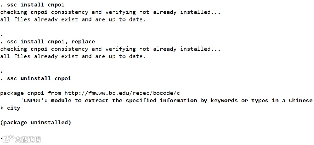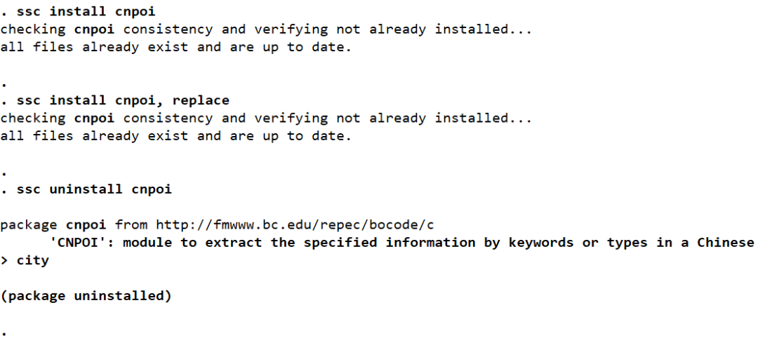 高端的“食材”往往采用最朴素的烹饪方式,最热门的命令也只需要简单的安装方法啦!运用ssc install 和ssc uninstall快速实现命令的安装与卸载。再次使用上面提到的命令CNPOI来做一次练习吧。