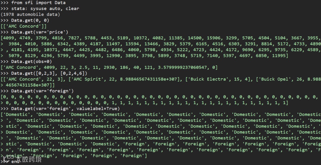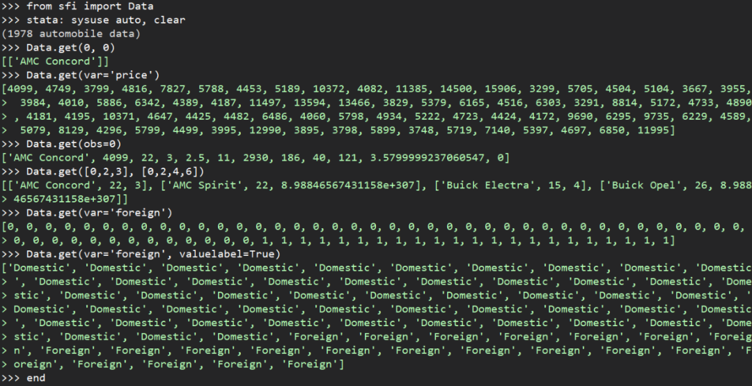 clear allpythonfrom sfi import Datastata: sysuse auto, clearData.get(0, 0)Data.get(var='price')Data.get(obs=0)Data.get([0,2,3], [0,2,4,6])Data.get(var='foreign')Data.get(var='foreign', valuelabel=True)end