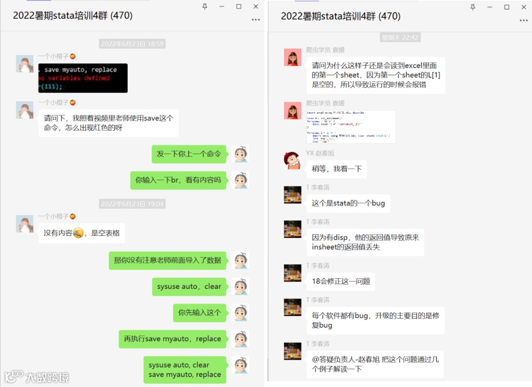 在炎炎的夏日里,新一期的 Stata 课程学习在如火如荼地进行中,纵使暑期持续高温,但是丝毫无法阻挡同学们的学习热情,同学们学习热情高涨,时不时提出自己在操作中遇到的难题,我们爬虫俱乐部答疑团队都在第一时间给出了详细解答,同学们得到解惑,纷纷感慨学习效率提高。