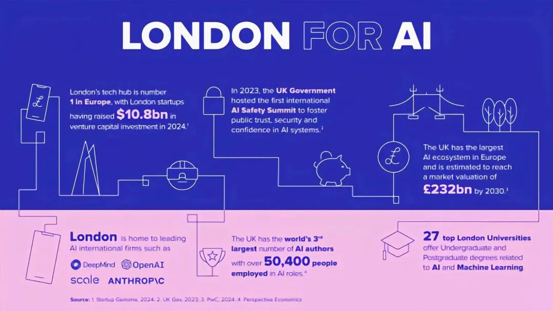 在产业端,伦敦汇聚了DeepMind、OpenAI、Meta、Google等国际头部企业;微软也宣布将在伦敦投资25亿英镑,建设全新AI中心,进一步强化伦敦在全球人工智能版图中的战略地位。
