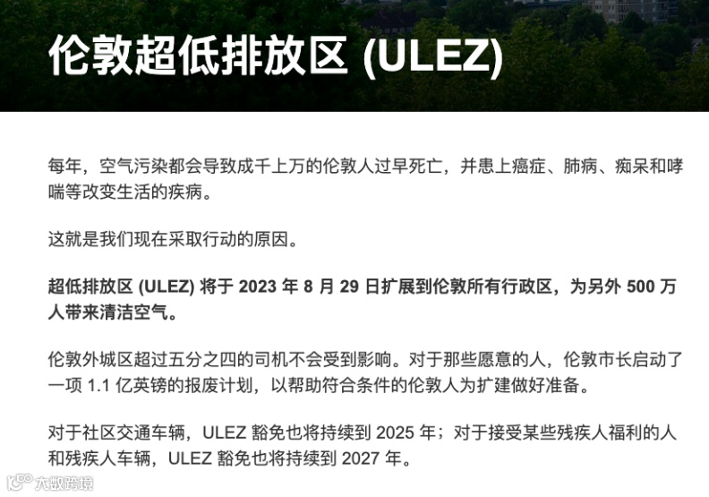 2008年,伦敦市政府实施了“低排放区”政策。例如“中心伦敦低排放区”(Central London Low Emission Zone)和“超低排放区”(Ultra Low Emission Zone)这些特定区域,会对高排放车辆实施限制和收费措施。收费金额根据车辆类型、排放水平和进入区域的时间来设定不同的标准。