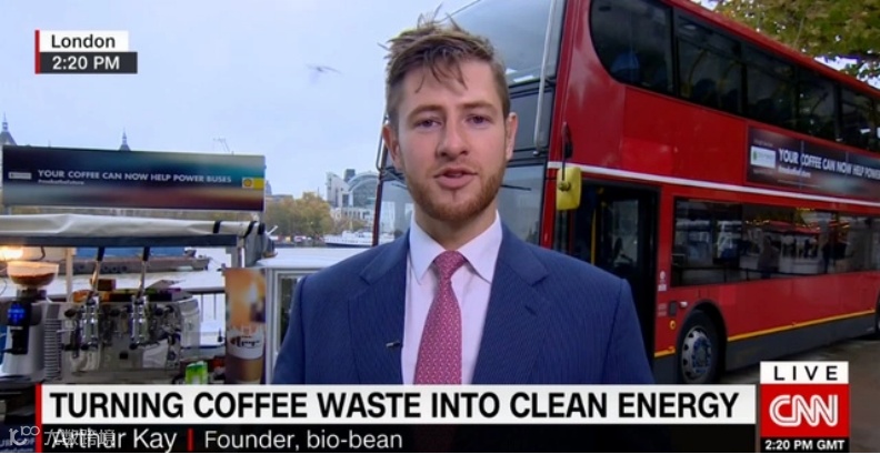 bio-bean 创始人 Arthur Kay,背后的红色巴士使用的是咖啡油燃料 来源 | CNN 视频截图