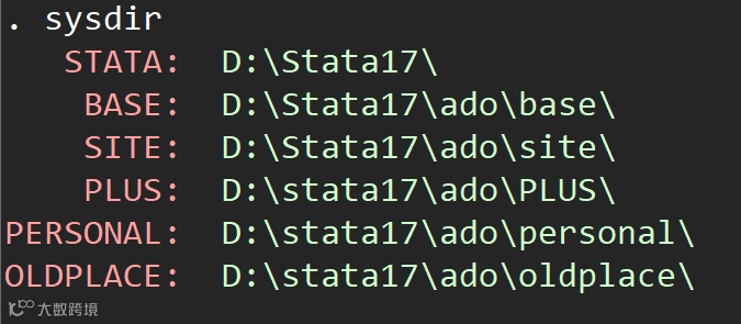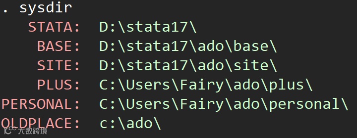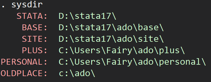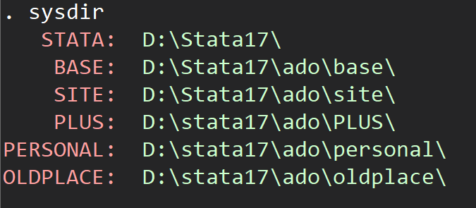 首先,我们可以查看一下Stata当前的安装及工作路径,输入sysdir,在下图中可以看到,stata、base、site、plus、personal、oldplace等文件夹的位置,其中base文件夹用于存储 Stata自带的基础命令 , plus文件夹用于存储外部命令 , personal用于存储自己编写的命令和do文件。