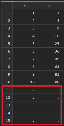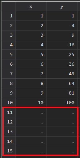 clear allset obs 10 // 生成10个观测值gen x = _n // 创建变量x (x=1, 2 ,3·········10)gen y = x^2 // 创建变量y (y=1,4,9……………100)moreobs 5 // 在数据集末尾添加五行观测值