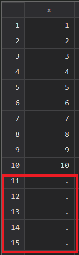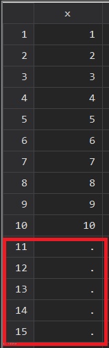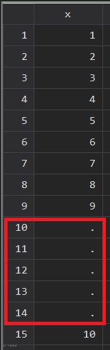 clear allset obs 10 // 生成10个观测值gen x = _n // 创建变量x (x=1, 2 ,3·········10)insobs 5, before(_N) //在最后一行观测值之前添加5行观测值