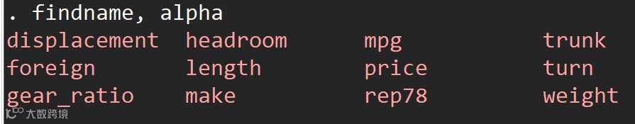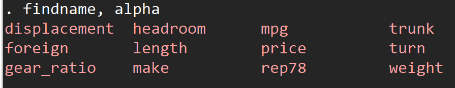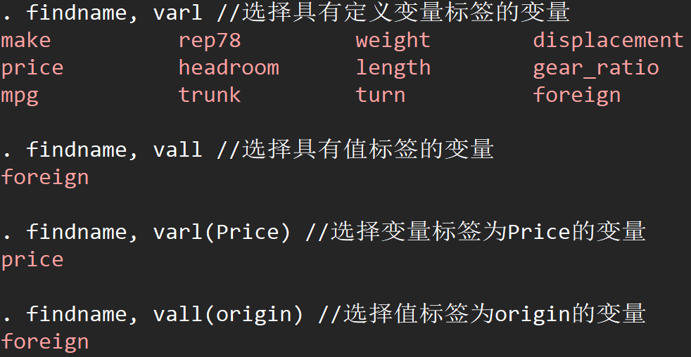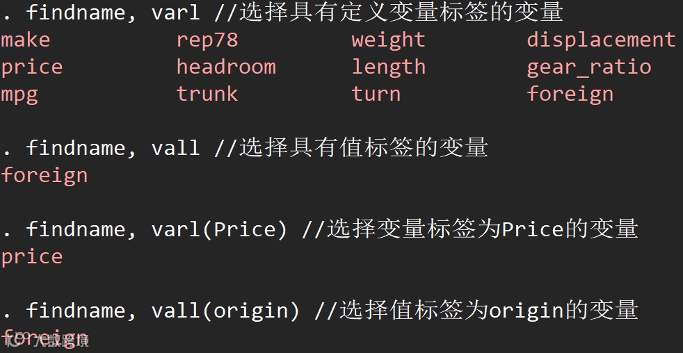 findname, varl //选择具有定义变量标签的变量findname, vall //选择具有值标签的变量findname, varl(Price) //选择变量标签为Price的变量findname, vall(origin) //选择值标签为origin的变量