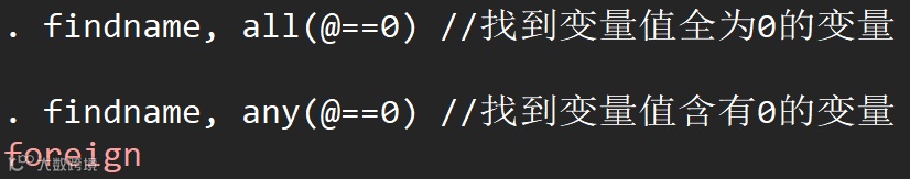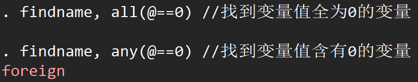 findname, all(@==0) //找到变量值全为0的变量,其中@代表变量名findname, any(@==0) //找到变量值含有0的变量