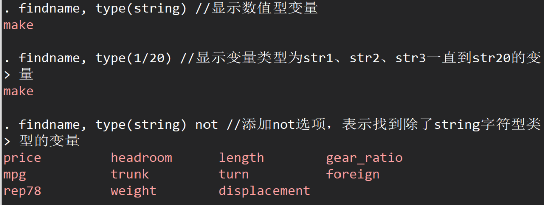 findname, type(string) //显示数值型变量findname, type(1/20) //显示变量类型为str1、str2、str3...str20的变量findname, type(string) not//添加not选项,表示找到除string字符型类型的变量