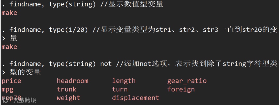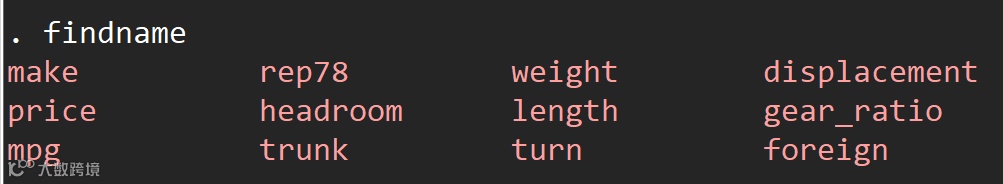 在Stata中,findname命令的语法结构也比较简单,如下所示: