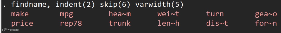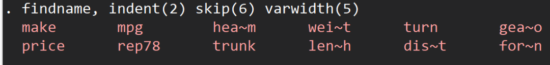 findname, indent(2) skip(6) varwidth(5) //设置显示变量名时每行缩进2,变量名之间的间距为6,变量名的显示宽度为5