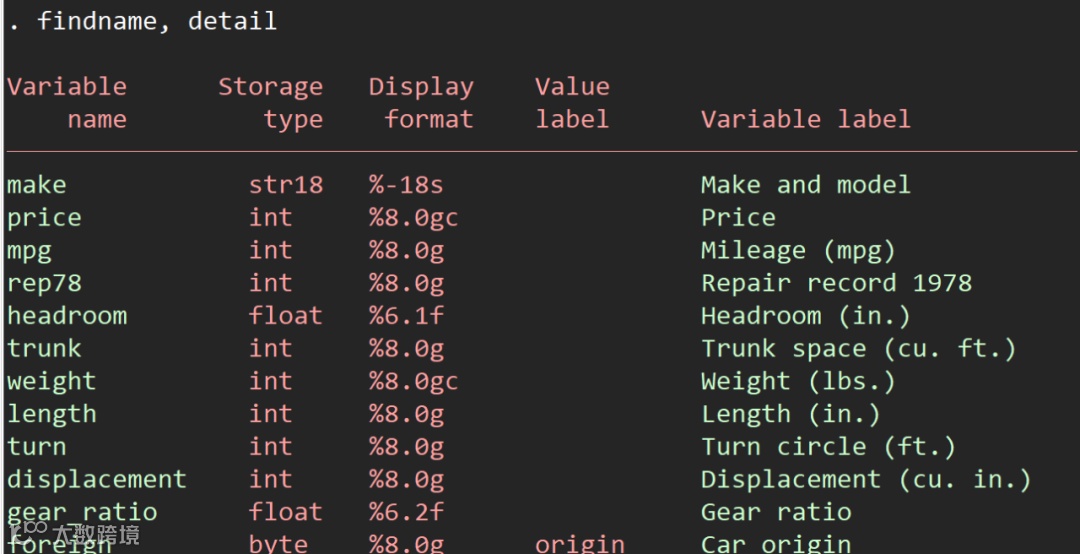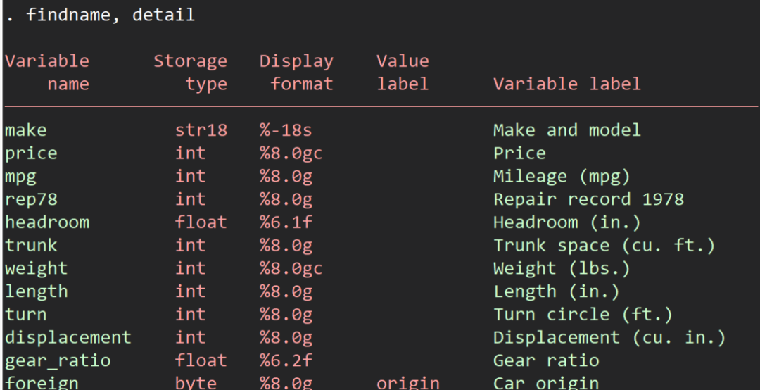 输入findname我们能看到所有变量的名称,如果需要变量的详细信息,我们可以输入findname, detail,显示变量的类型、格式、标签等信息:
