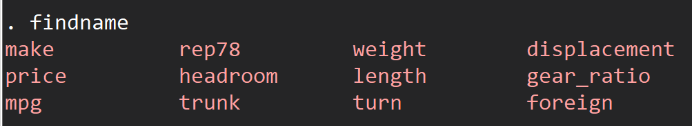 r(varlist)中,同时findname命令还有local()选项,可自定义局部宏名称,方便后续进行调用。我们看一下调用返回值的一个小例子: