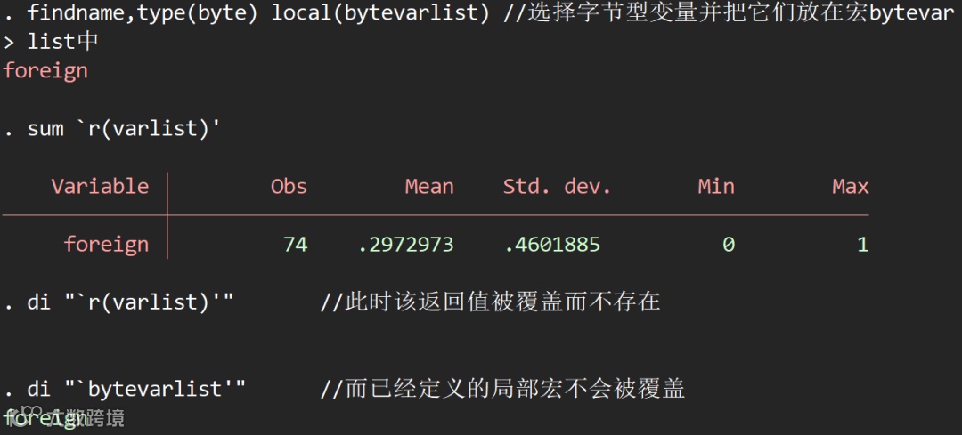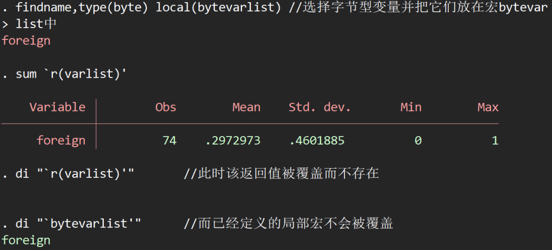 findname,type(byte) local(bytevarlist) //选择字节型变量并把它们放在宏bytevarlist中sum `r(varlist)'dis "`r(varlist)'" //此时该返回值被覆盖而不存在di "`bytevarlist'" //而已经定义的局部宏不会被覆盖