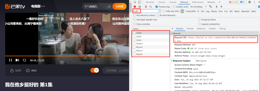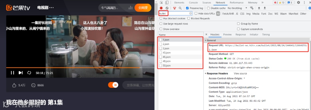 和爱奇艺视频类似,芒果TV视频的弹幕也是动态加载的。以第一集为例,按下F12打开浏览器开发者工具,点击"Network",在左上角的搜索框输入"bullet",再"Ctrl+R"刷新,随着视频的播放,每隔一分钟,就会出现一个新的json文件。如下图所示,将视频进度直接拉到50分钟处,就会出现一个50.json文件。