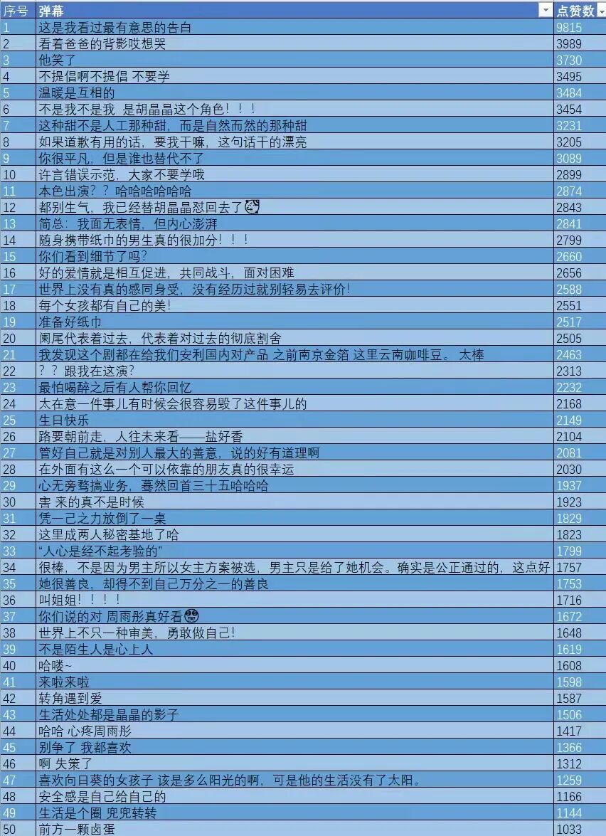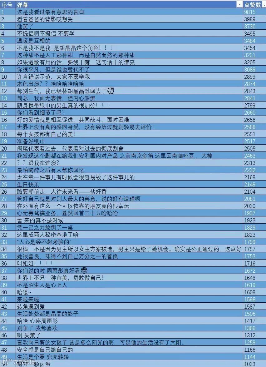 在这28万条弹幕中,点赞TOP50的弹幕内容如下: