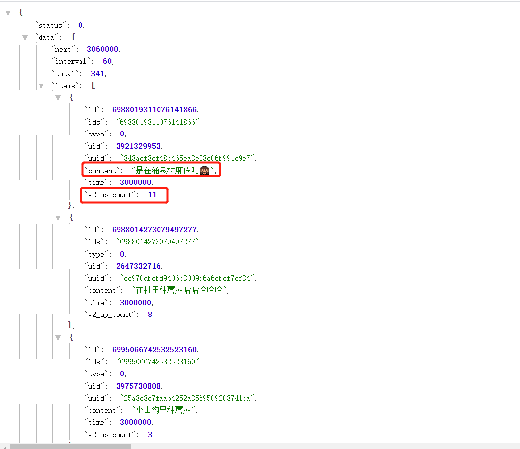 获取弹幕链接后,就可以提取相关信息了。在浏览器中打开文件链接,可以发现这是一个标准的json文件,如下图所示。我们需要提取两个重要信息,一是弹幕内容"content",二是该弹幕点赞数"v2_up_count"。