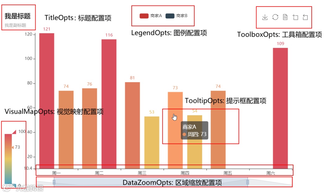 可以看出全局配置项里包括标题配置项、图例配置项和视觉映射配置项等组件。可以简单地理解为全局配置项里这些具体的组件是作用在全局的,也即作用在整个图形中的。在官方文件中一共介绍了22个组件,他们大多都有异曲同工之处,本文就不一一赘述,所以本文以最常用的组件TitleOpts:标题配置项为例,展示如何学习设置全局配置项。