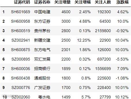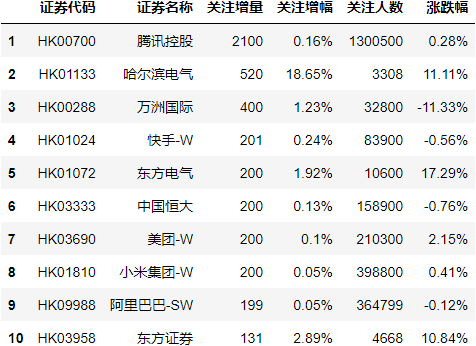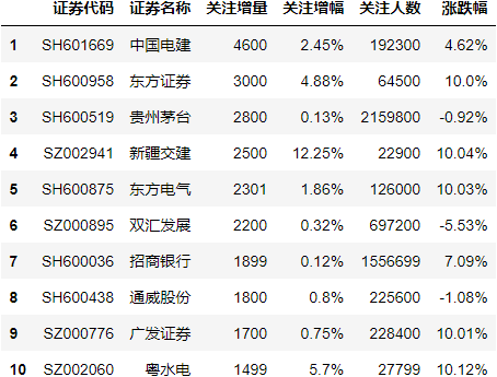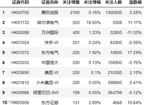 最后,我们为大家揭秘雪球网(https://xueqiu.com/)最新所展示的沪深证券和港股关注人数增长Top10。