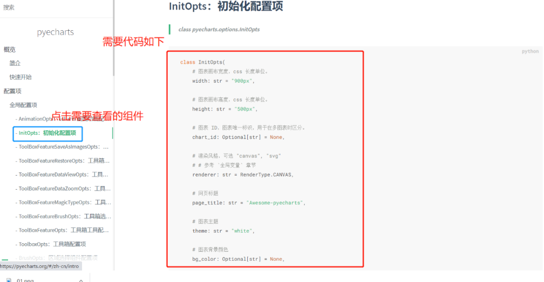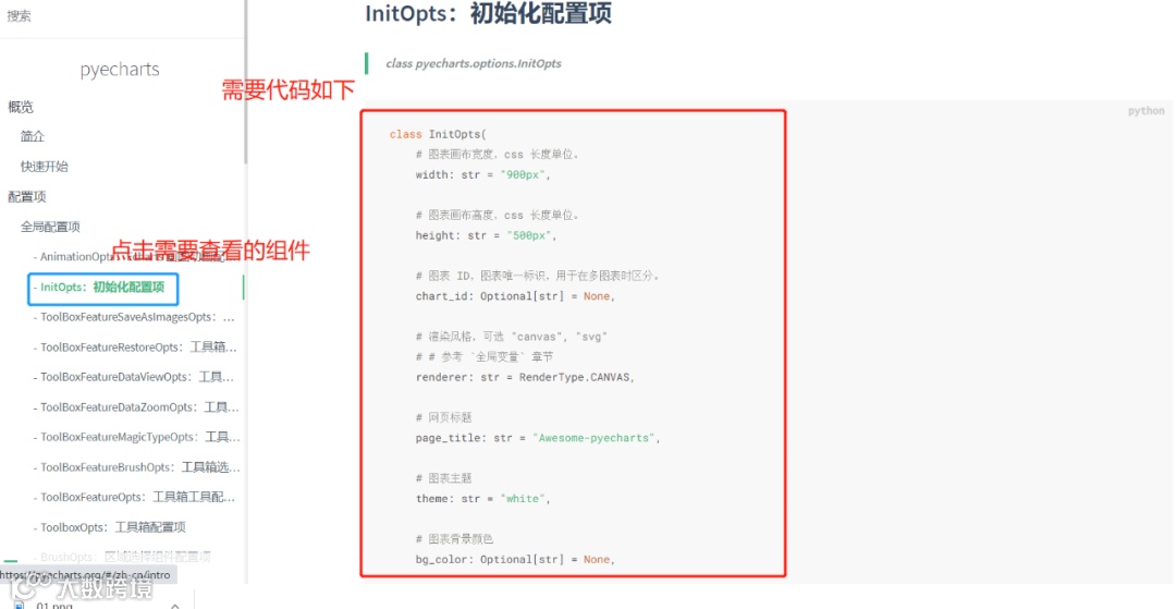 padding指的是标题内边距,根据注释padding的值可以是5、也可以为[5,10]、也可以是[5,10,5,10]。当然还有一些参数的值甚至可以是字典,这里就不多说了,大家在实战中注意即可。关于其他组件的代码,大家可以在官方文档里寻找,相应网址是“https://pyecharts.org/#/zh-cn/global_options”。具体看下图: