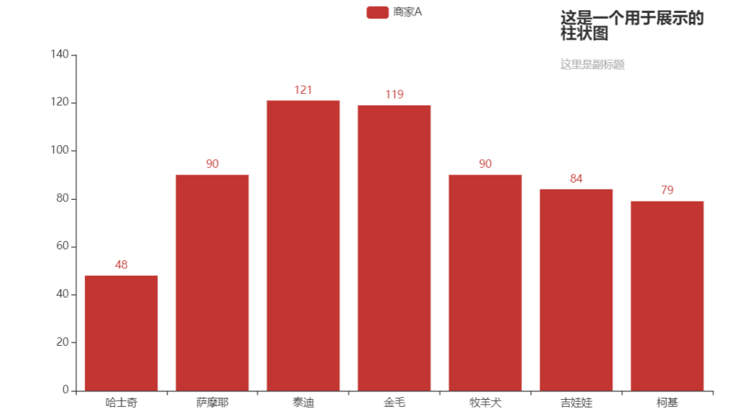 c = (Bar().add_xaxis(Faker.choose()).add_yaxis("商家A", Faker.values()).set_global_opts(title_opts=opts.TitleOpts(title="这是一个用于展示的\n柱状图",subtitle = "这里是副标题",pos_right = "10%",padding= [10,10,10,10],item_gap = 20),))c.render_notebook()