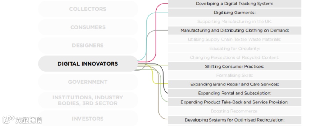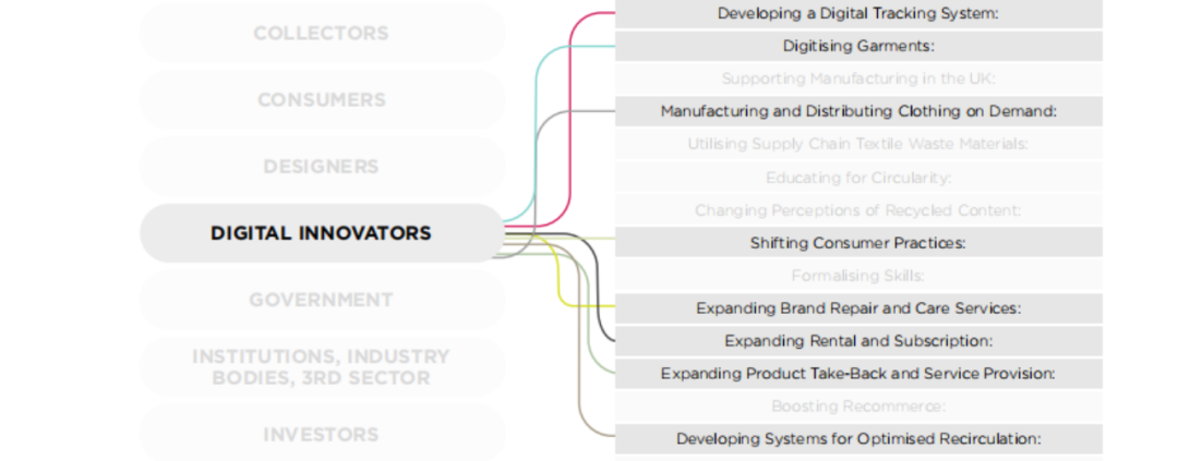 像DeepGears这种用科技创新赋能可持续时尚的企业,被英国时装委员会(British Fashion Council)归纳为digital innovator(科创者)的角色,是实现循环时尚的利益相关者之一。