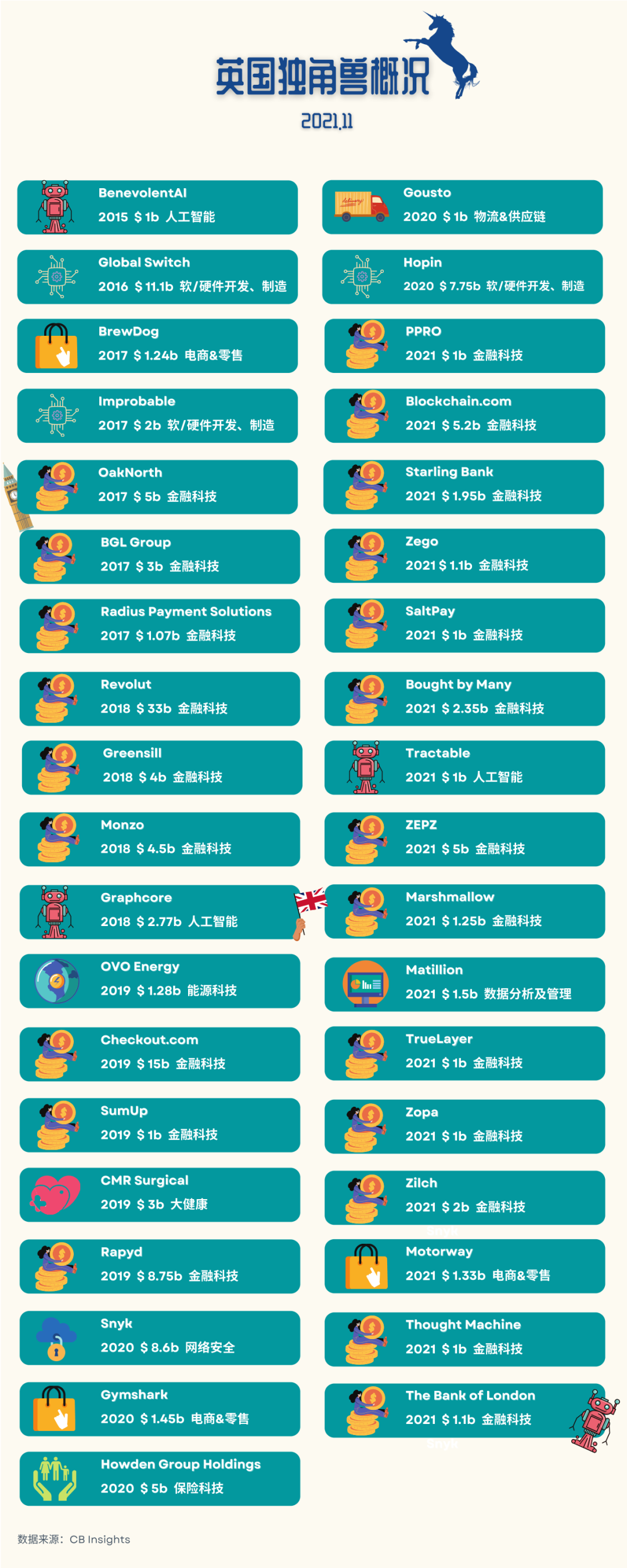 根据 CB Insights 的统计,截至2021年11月,英国的37家独角兽企业中,22家来自金融科技赛道,3家与电商零售相关,而与健康、保险和能源相关的企业一共有3家。