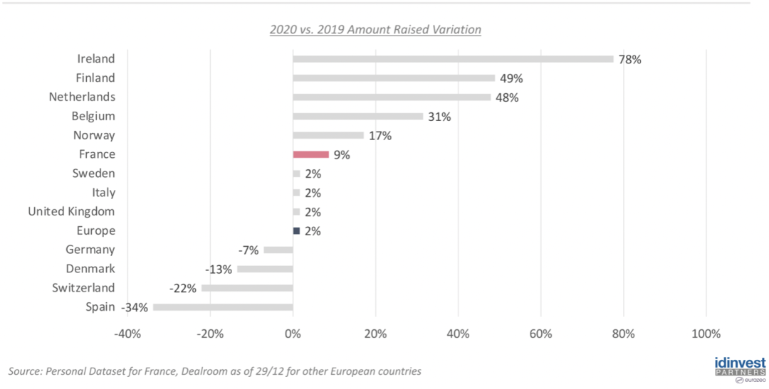 此外,2020年欧洲初创企业总融资金额只增加了2%,英国和意大利同比增长也为2%,法国为9%,而德国则下降7%。