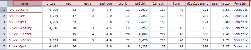 我们可以看到mpg,rep78这两个变量均已放到了变量列表的最前面。此处需要注意第一行代码中的first选项是默认选项,不加first也可以达到相同的效果。