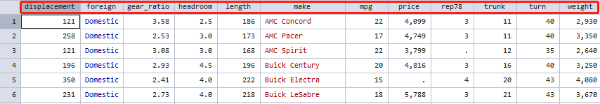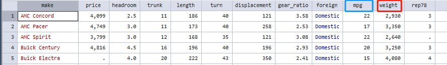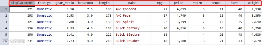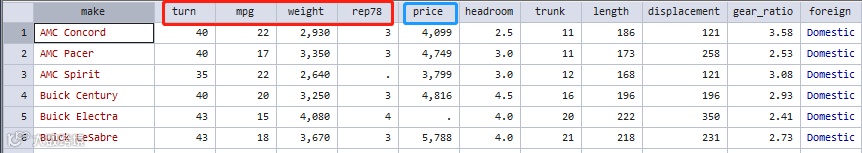 如图所示,变量turn、mpg、weight、rep78已经调到了price的前面,是不是操作起来很简单呢?