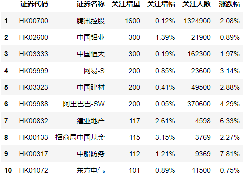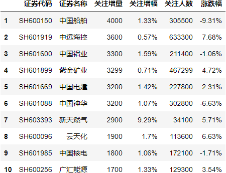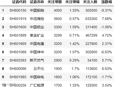 最后,我们为大家揭秘雪球网(https://xueqiu.com/)最新所展示的沪深证券和港股关注人数增长Top10。