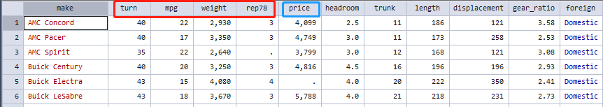 order turn mpg-rep78,before(price) //把turn、mpg、weight、rep78调到price的前面br