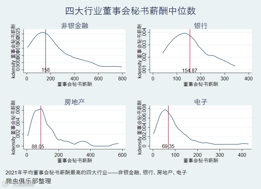 从行业来看,2020年董秘薪酬平均最高的行业(果然)是非银金融。银行和房地产业次之,电子行业的平均董秘薪酬刚好超100万。其他如钢铁、商业贸易、医药生物等行业差距不大,接近100万。