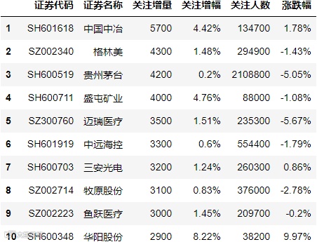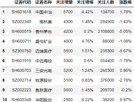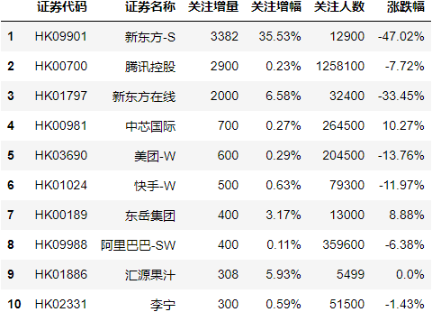 最后,我们为大家揭秘雪球网(https://xueqiu.com/)最新所展示的沪深证券和港股关注人数增长Top10。
