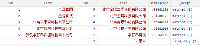既然如此,我只好请出模糊匹配的大佬——matchit。今天我们不直接讲干巴巴的语法,直接“上菜”,理解了这个小案例再去help matchit包你事半功倍!第二行主代码中,id1,firm1为master的唯一标识var和待模糊匹配的公司名称;id2,firm2为using file(file2)中的唯一标识var以及与firm1不完全一致的公司名称。