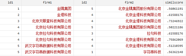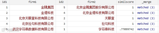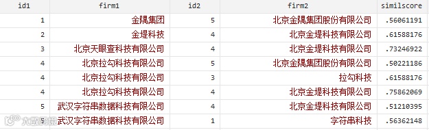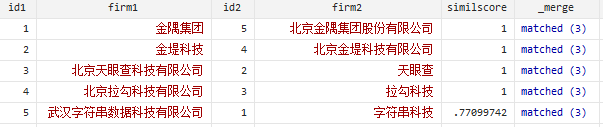 我们对新生成的“桥梁”数据集进一步保留与每个firm1匹配相似度(similscore)最高的firm2。