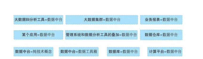 数据中台与企业的业务发展方向、企业的组织结构、信息 化发展程度等均有着紧密的联系,所以单纯地认为数据中台是工具、大数据分析方法或者组织架构等都是错误的。市场上对数据中台并没有一个统一的定义,不同人对数据中台的定义都不相同。下面介绍对数据中台的 10 个错误认知,如下图所示,帮助企业在理解数据中台时避免走入误区。