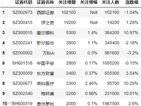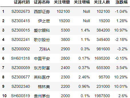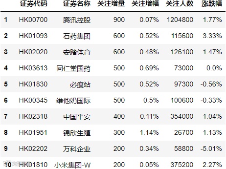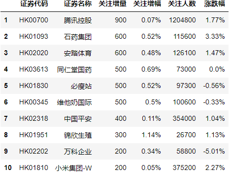 最后,我们为大家揭秘雪球网(https://xueqiu.com/)最新所展示的沪深证券和港股关注人数增长Top10。