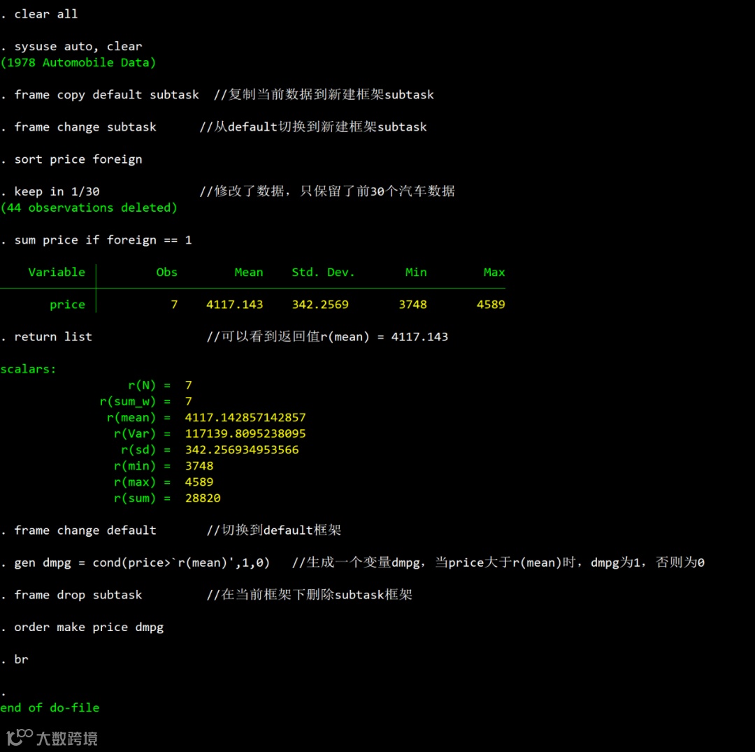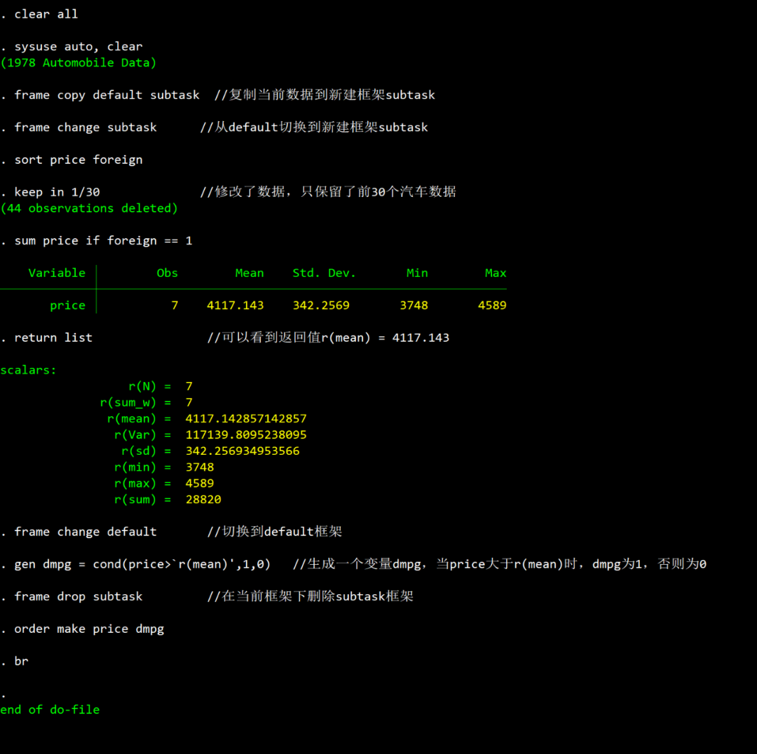 在这里需要注意:虽然r(mean)是在框架subtask中通过sum price if foreign == 1得到的,但它实际上是储存于Stata内存之中,与框架无关。