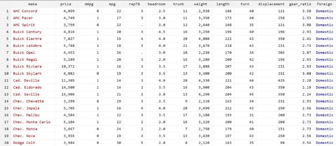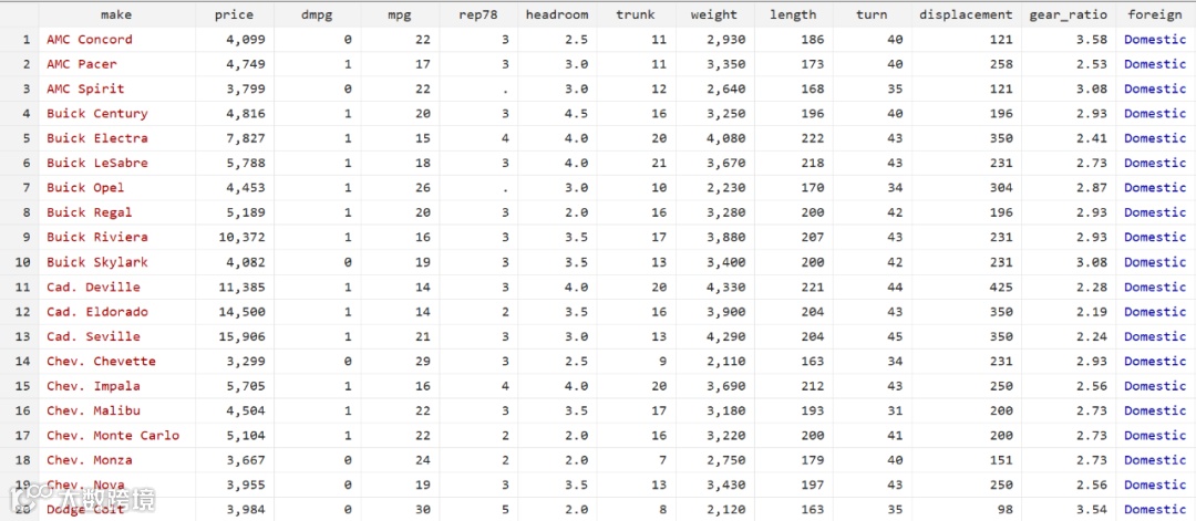 clear allsysuse auto, clearframe copy default subtask //复制当前数据到新建框架subtaskframe change subtask //从default切换到新建框架subtasksort price foreignkeep in 1/30 //修改了数据,只保留了前30个汽车数据sum price if foreign == 1return list //可以看到返回值r(mean) = 4117.143frame change default //切换到default框架gen dmpg = cond(price>`r(mean)',1,0) //生成一个变量dmpg,当price大于r(mean)时,dmpg为1,否则为0frame drop subtask //在当前框架下删除subtask框架order make price dmpgbr