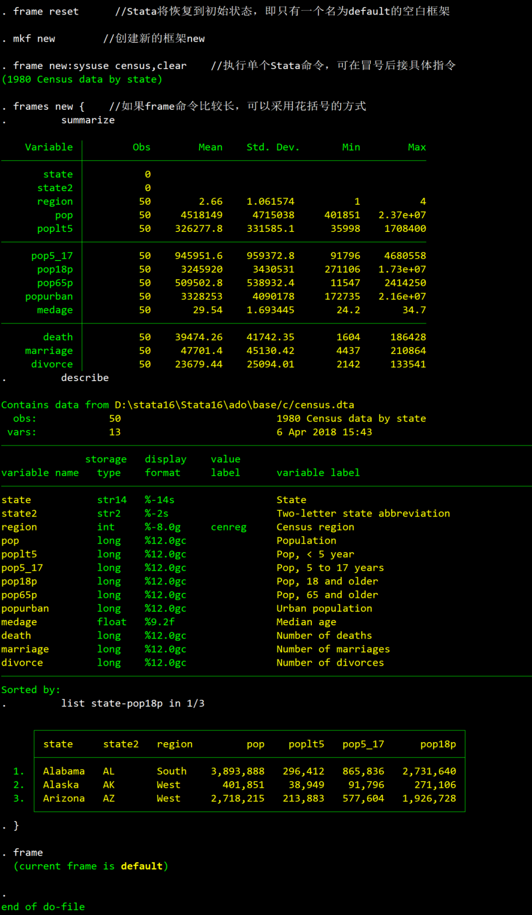 frame reset //Stata将恢复到初始状态,即只有一个名为default的空白框架mkf new //创建新的框架newframe new:sysuse census,clear //执行单个Stata命令,可在冒号后接具体指令frames new { //如果frame命令比较长,可以采用花括号的方式summarizedescribelist state-pop18p in 1/3}frame
