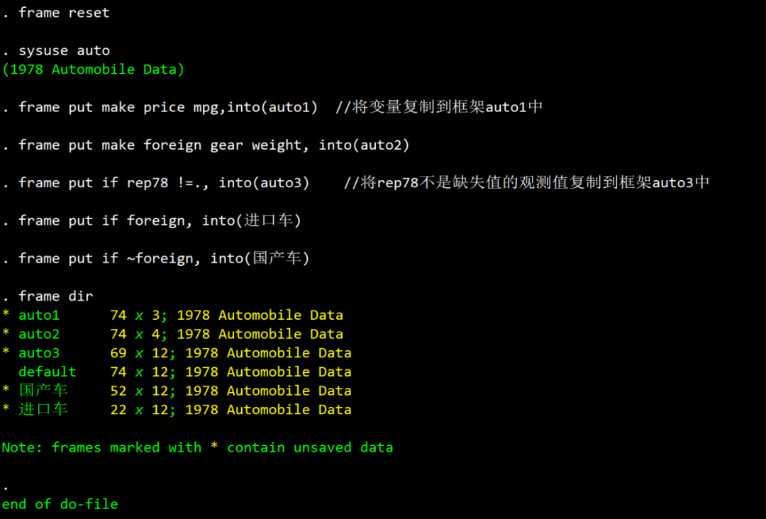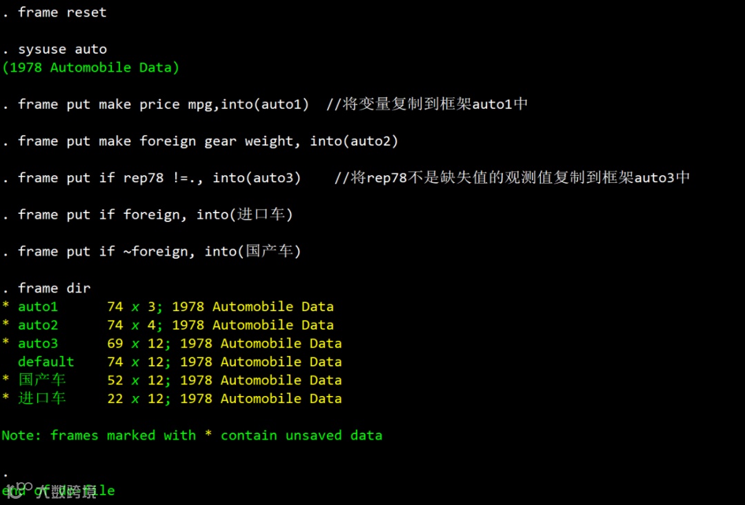 frame resetsysuse autoframe put make price mpg,into(auto1) //将变量复制到框架auto1中frame put make foreign gear weight, into(auto2)frame put if rep78 !=., into(auto3) //将rep78不是缺失值的观测值复制到框架auto3中frame put if foreign, into(进口车)frame put if ~foreign, into(国产车)frame dir