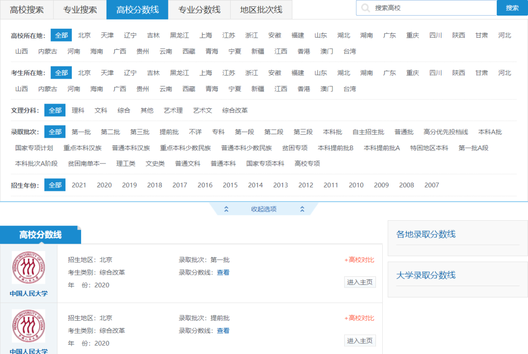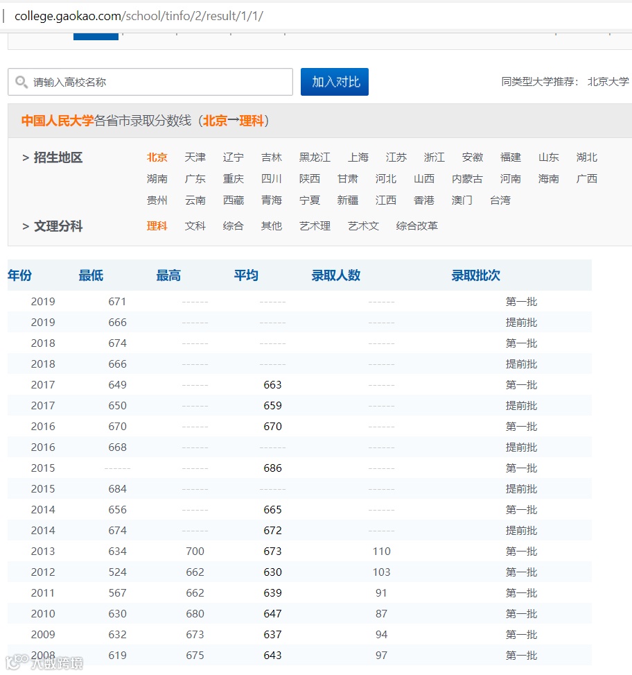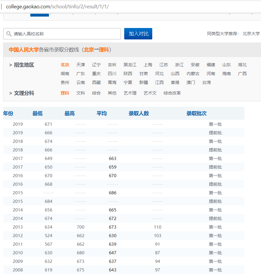 比如清华大学,会发现网址变为http://college.gaokao.com/school/tinfo/3/result/1/1/。不难发现,网址中的三个数字依次代表学校代码,招生地区代码和文理分科代码,改变筛选条件时只需改变网址中对应的参数即可。