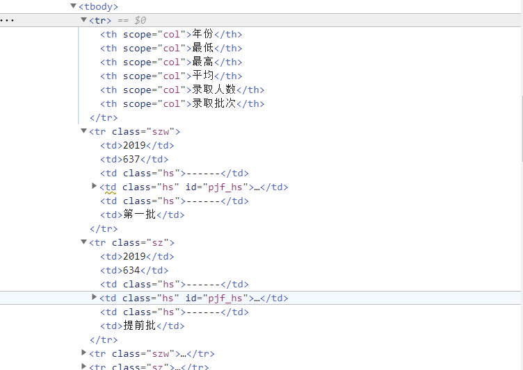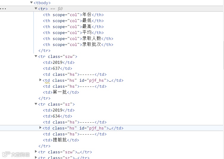 可以看到,所有的分数线数据都存储在<tr>…<tr>标签里。我们使用Xpath语句在行中进行迭代,就可以拿到分数线数据了。