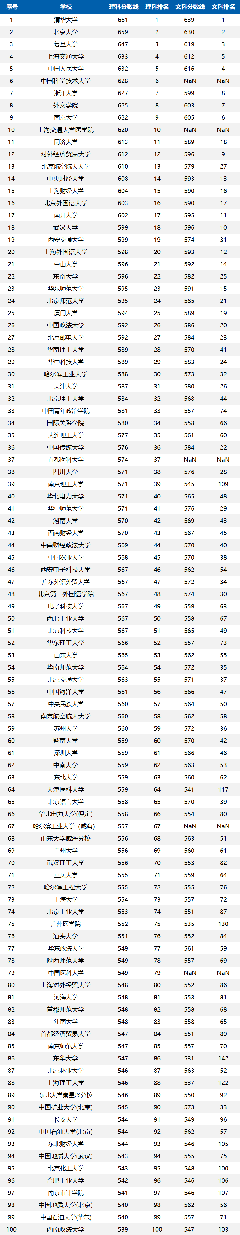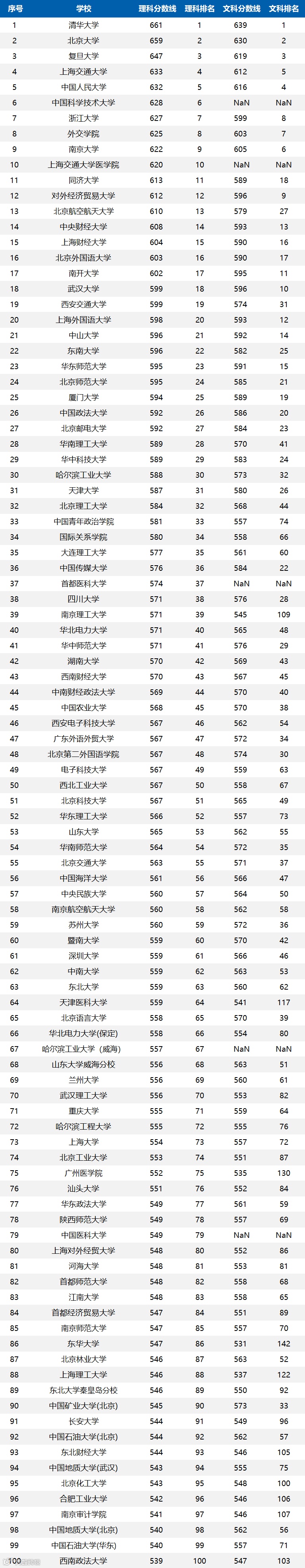 在此声明:本排行榜根据高考网中的历史录取数据计算得到。截止年份为2020年,计算方法为高校各年在各地录取分数线的简单平均(本文承认此计算方法存在诸多不足,如未考虑各高校在各地区招生规模的差异,各地区考生之间的差异等,本文的目的仅在于反映历史录取的平均情况),并在计算中剔除了以下数据:①录取分数线缺失的数据。②在理科或文科中录取信息少于30的高校。③异常数据。