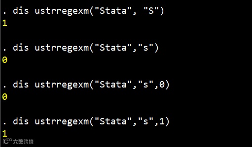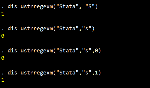 dis ustrregexm("Stata","s",0) //在区分大小写的情况下,在Stata中没有匹配到s,因此返回值为0