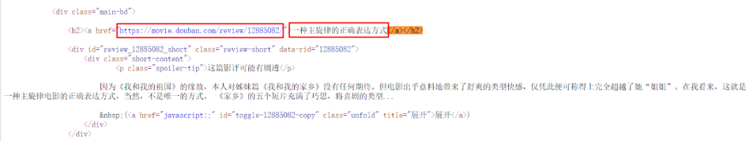 在网页的源代码中,可以观察到标题和链接都位于含有</a></h2>的行,因此我们需要的就是利用正则表达式保留目标行、提取影评的标题和链接,以便之后使用链接进一步抓取影评内容。