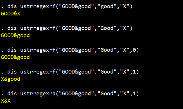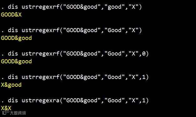 dis ustrregexm("Stata","s",1) //在不区分大小写的情况下,在Stata中匹配到了s,因此返回值为1