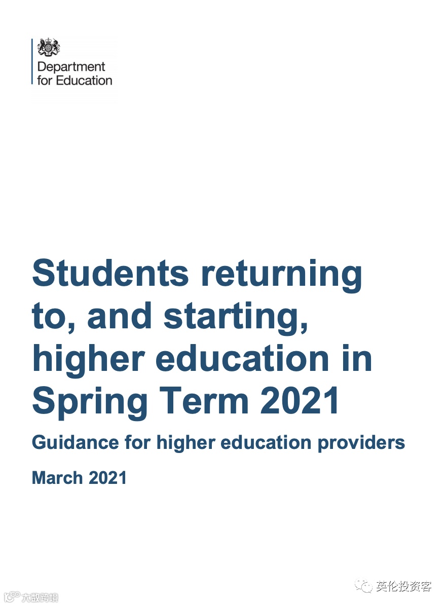 《2021年英格兰高等学校春季返校指南》共36页,下载链接为:https://assets.publishing.service.gov.uk/government/uploads/system/uploads/attachment_data/file/967410/Students_returning_to__and_starting__higher_education_in_Spring_Term_2021.pdf